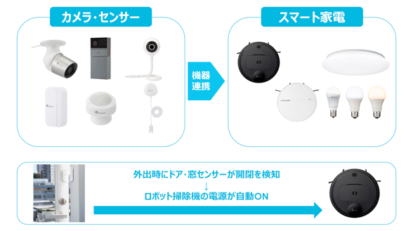 同社が今年2月に発売したカメラ・センサー製品と今回の新製品たちを連携させれば、アプリ操作や音声操作なしに「ドアを開けたら電気がつく」「外出したらロボット掃除機が自動で掃除をスタートする」という挙動が可能だという。
