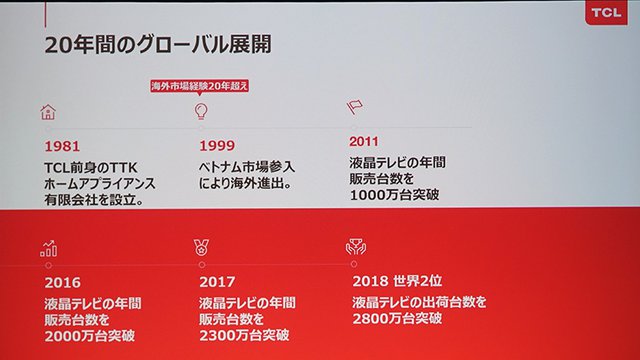 発表会で最初に登壇したTCL 海外事業部最高マーケティング責任者のEileen Sun(アイリーン・ソン)氏は、TCLが様々な国や地域で活動する歴史あるグローバルなブランドであり、2018年には世界第2位となる2800万台の液晶テレビを出荷したこと紹介。世界的に広く受け入れられているブランドであることをアピールする。