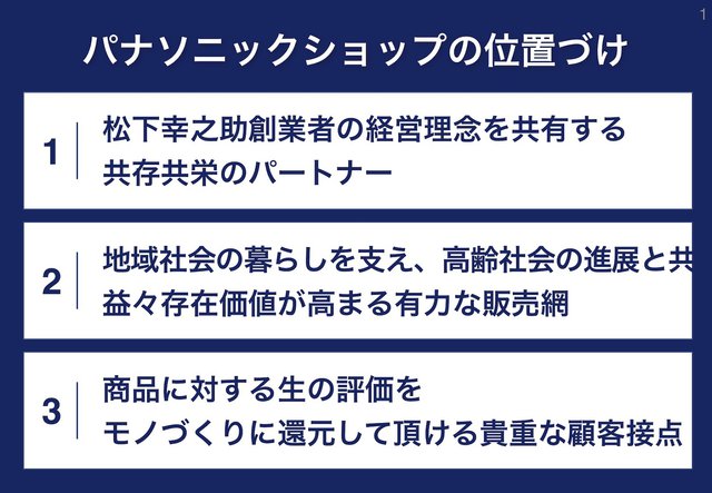 パナソニックショップは全国約15,000店。「パナソニックショップ様と一緒に取り組み、顧客満足を最大化できる」とその重要性をあらためて強調し、位置付けを3つのポイントで説明した。