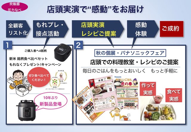 炊飯器・圧力鍋は9月-10月に。新米 銘柄食べ比べセットプレゼントや、個展・店頭でのレシピ提案など接点活動で実感体験を促進する。掃除機は11月-12月に。ロボット掃除機やコードレスサイクロンなど高価値商品のみならず、お客様の使い方に合わせキャニスタータイプもしっかりと提案していく。最大のキャンペーンとして、東京オリンピック観戦チケットがプレゼントされる「東京2020キャンペーン」、12月からの第2弾の応募期間に向け取り組んでいく。