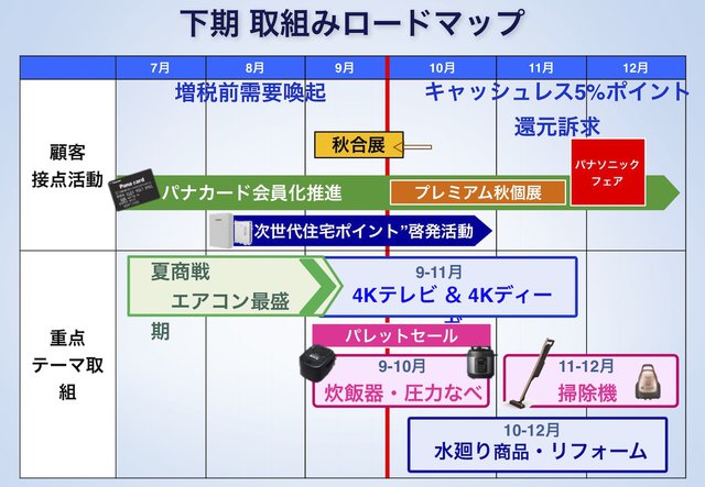 増税後は、中小企業向けのキャッシュレス決済5%還元の国策を生かす。パナカード会員を増やし、上得意客に向けたプレミアムな個展を展開。そこで新商品や高価値商品を販売、さらにセット販売も推進する。そのために新商品の発売時期も増税後のタイミングに合わせていく。また下半期から新たに国策として次世代住宅ポイントが展開されるのに合わせ、水回り設備商品の訴求を強化する。