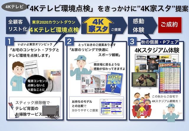 パナソニックショップを対象にした販売キャンペーンもさらに注力。4Kテレビ ビエラとレコーダー ディーガは9月-11月。「AVは今年に入り毎月順調に伸長。前回エコポイント時に販売されたものの買い替えタイミングやオリンピック需要が追い風に。秋商戦でさらに盛り上げる」。事前にコンセントやプラグの点検活動を行いながら、家でスタジアムの臨場感を味わう提案を行っていく。