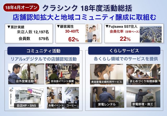 パナソニックショップのブランド価値向上につなげるテストマーケティング展開として、PCMCが2018年4月から「Fujisawaサスティナブル・スマートタウン」内のショッピングモール「湘南T-SITE」で展開している店舗「クラシンク」の近況も報告された。1年目の取り組みでは、店舗の認知拡大と地域のコミュニティ醸成を推進した。来店人数は累計で12,197名で、うち会員となったのは579名。パナソニックショップへの取り込みを狙う30-40代の顧客層が62%にのぼっているという。「さまざまなサービスを展開しているが、今後パナソニックショップに移植できるようなことをさらに開発していく」。