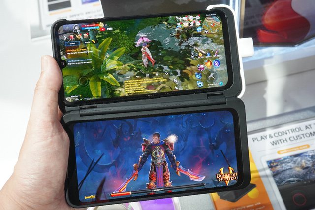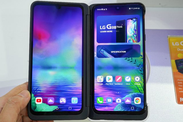 会場では一つの製品のように展示されているが、元は6.4インチの2,340×1,080ドットの有機EL画面を搭載したスマホ LG G8X ThinQと、USBケーブルで接続する同じ6.4インチの2,340×1,080ドットの有機ELディスプレイ・アクセサリーLG Dual Screenの組み合わせ。専用の画面つきケースにLG G8X ThinQを装着することで2画面スマホとして使えるという構造のため、縦向きに開いた状態では大きなラインが入ることになる。