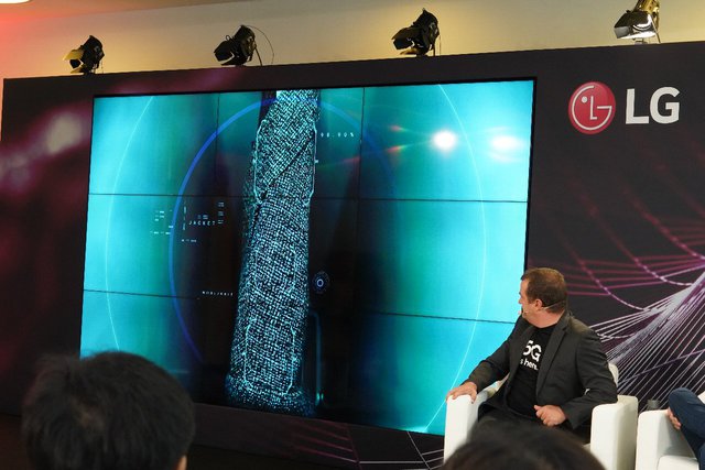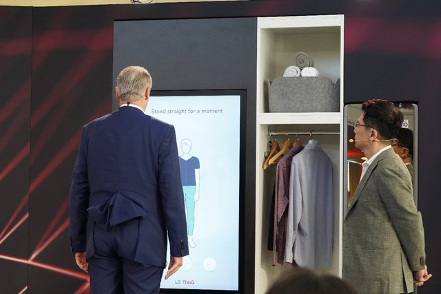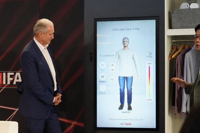 もう一つ初披露されたアイテムが「LG ThinQ Fit」。3Dカメラを内蔵したスマートミラーで、人の体をスキャンして体型を測定、画面に映し出したアバターを操作して洋服を選べる。ただの着せ替えだけでなく、服の寸法も正確に登録されいることがポイントで、体の部位できつい所、ゆるい所を緑から赤の色で表示できる。