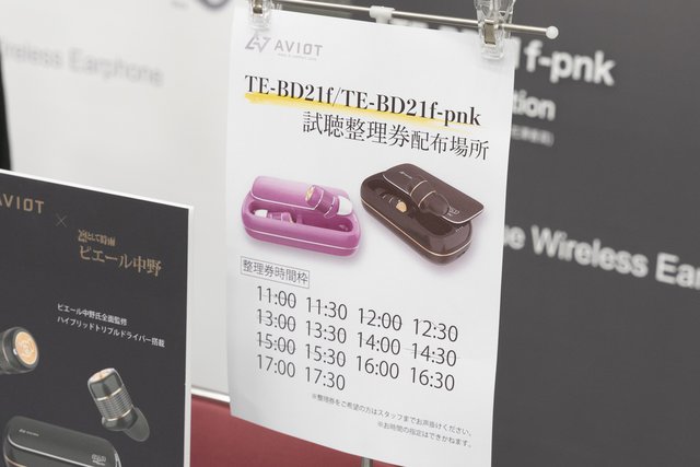AVIOTブースでは、ダイナミック/BAドライバーハイブリット構成の完全ワイヤレスイヤホン「TE-BD21f」「TE-BD21f-pnk」を出展。ロックバンド「凛として時雨」などで活躍中のドラマー・ピエール中野氏がチューニングしたTE-BD21f-pnkは、7月に開催された「ポタフェス2019東京」でも試聴に多くのファンが詰めかけていたが、ここ梅田でも整理券による試聴が行われるほど話題を集めていた。