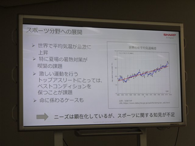 スポーツ分野への展開では、夏場などの暑熱対策にフォーカス。スポーツ分野のアドバイザーである株式会社ウィンゲート 代表取締役 の遠山健太氏と共同で開発を行なっている。遠山氏は「暑熱対策としてプレクーリング(事前冷却)が、深部の体温を下げ暑い中でもパフォーマンスを維持するのに効果的だとされている。またこの考え方を浸透させることで、ご高齢の方や子供さんなどが熱中症の犠牲になるのを防ぐことにつながる」と期待を寄せる。