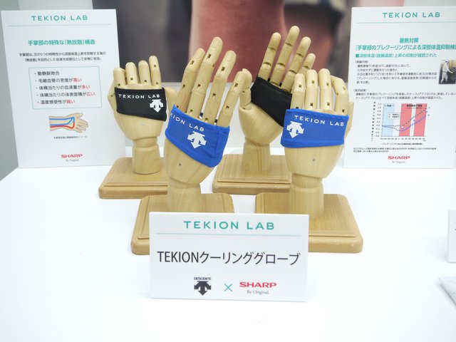 さらに、シャープとウィンゲート、およびデサントジャパン株式会社が共同開発しているのは、「TEKION 暑熱対策グローブ」。融解温度+12℃の蓄冷材が入るポケットが手のひら側についたグローブである。手のひらは特殊な熱放散構造をもち、ここを冷やすと深部体温の上昇を抑制するという。氷や保冷剤などで冷やすと温度が下がりすぎて痛みが感じられるが、シャープの蓄冷材を用いると快適な冷たさを保持できるという。