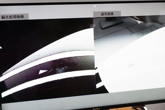 この偏光が役立つのは、主に検査や検出の分野とのこと。デモでは一例として、車体の塗装につけられた傷、透明な物体の歪みなど通常は人間の眼でみることのできない映像を可視化させていた。