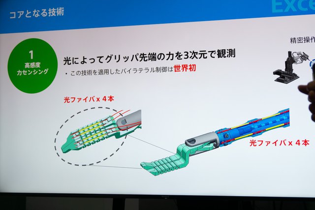 これを実現する大きな要素は、光ファイバーを用いたセンシング技術。配置した光ファイバーの歪みを検出し、そのデータからどのくらいの力なのか取得する。これを先端に4本、手首の部分に4本搭載することで、様々な方向から加わる力も検出できるという。
