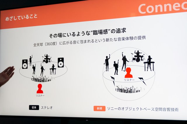 サウンドについては、今年のCES2019で発表したオブジェクトベース空間音響技術「360 Reality Audio」を改めてアピールした。この技術は従来のステレオ再生とは異なり、360度からの音にリスナーが包まれるという音楽体験を実現するもの。