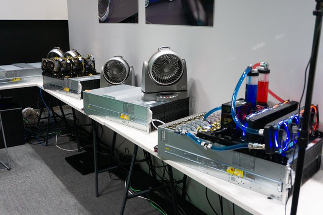 デモにはGPU(Geforce GTX2080 Ti)を各10枚搭載したサーバー3台を用いて、リアルタイムに空間を生成。1ピクセルあたり72光線軌道、これを4K(約830万)分実施し、1フレームあたり597,196,800通りの計算が行われる。