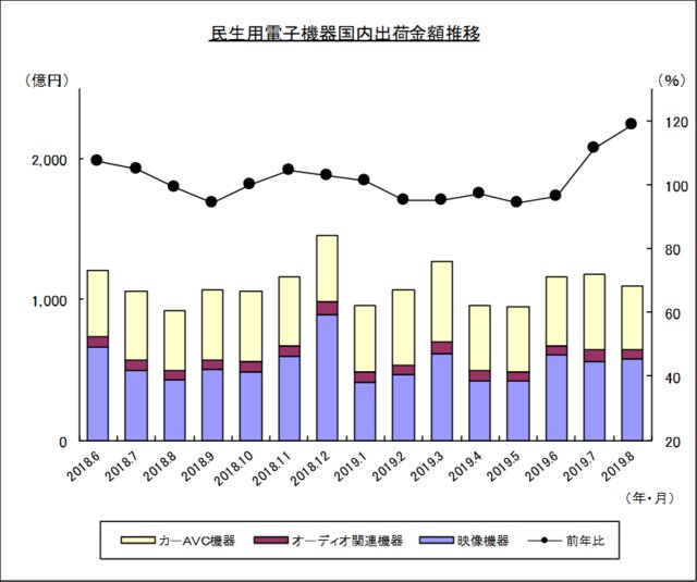 民生用電子機器の8月国内出荷金額は1,091億円(前年比118.5%)。映像機器は576億円(前年比133.4%)、オーディオ関連機器は65億円(前年比102.6%)、カーAVC機器は450億円(前年比105.7%)だった。
