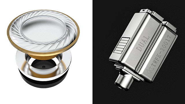 中低域に10mm ダイナミックドライバー、中高域にKnowles製のデュアルBAドライバーユニット「TWFK-30017」を搭載したハイブリッド型イヤホン。ダイナミックドライバーは、PU+PEEK素材の複合振動板「ナノコンポジットダイアフラム」や、OFCボイスコイル、「ダブルマグネット構造」「ダブルキャビティー構造」を採用することで、中低域の分解能/パワフルさ/キレの良さなど複数の要素を同時に実現しているとする。