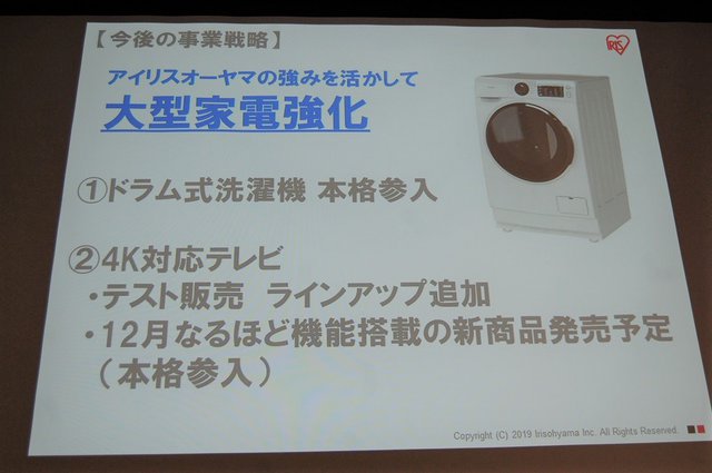 アイリスオーヤマは、拡大する家電事業の現状と今後の戦略について説明会を開催。テスト販売の好結果を受け、本格参入を決定したドラム式洗濯機の新製品を発表するとともに、4K対応液晶テレビにおいても本年12月をめどに本格参入を計画していることを明らかにした。