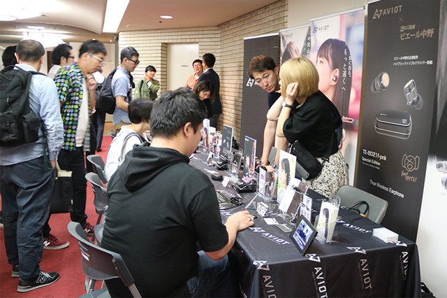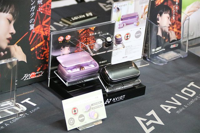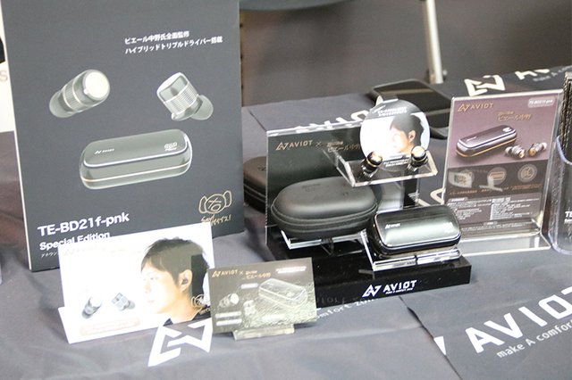 会場にはAVIOTブランドの完全ワイヤレスイヤホンの体験ブースも設置。最新フラグシップモデル「TE-BD21f」、ピエール中野氏監修で大人気の “ピヤホン” 「TE-BD21f-pnk」はもちろん、1万円以下の小型モデル「TE-D01g」や、ピエール中野氏が愛用Bluetoothイヤホンとして紹介し話題となった「TE-D01d」など、多彩な製品がずらりと並ぶ。
