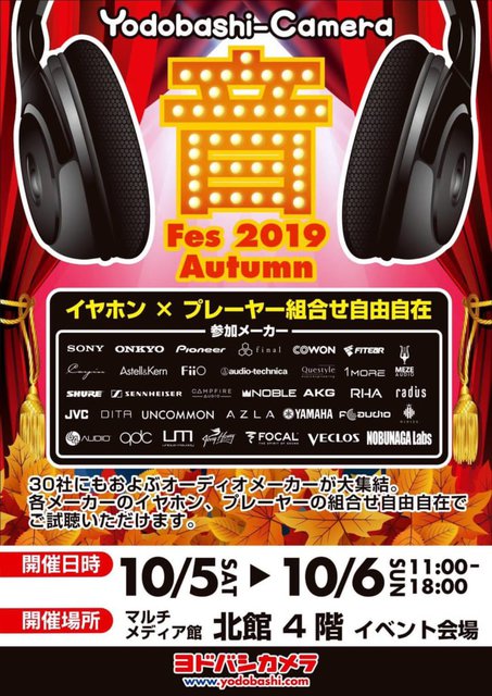 会場となるのはヨドバシカメラ新宿西口店で開催の「音フェス 2019 Autumn」のNoble Audioブース、およびe☆イヤホンのSHIBUYA TSUTAYA店、秋葉原店。試聴会の日程は、音フェス 2019 Autumnでは両日11時から18時、e☆イヤホンのSHIBUYA TSUTAYA店では5日12時から19時、秋葉原店は6日11時から19時までとなる。