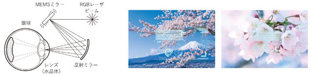 網膜投影式では網膜に直接レーザーで照射するので、視力やピント位置に依存せずに常にクリアな映像を見ることが可能という。これには「VISIRIUM Technology」という、超小型プロジェクタを使用し、微弱なレーザ光で網膜上をスキャン(走査)することで、直接映像を投影する技術を使用している。