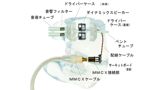 同社カスタムIEMの特徴である、高い遮音性とフィット感を実現するフルシリコンシェルの中に、「音楽用としては最小クラス」という5mmダイナミックドライバーを2基内蔵する。ドライバーはベント(空気穴)付きの専用ケースに収めた上でシリコン内に埋め込む構造を取っており、振動板を適切に動作させるための空間を確保している。