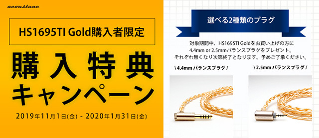 なお、2019年11月1日から2020年1月31日までの間、HS1695TI Gold購入者向けにバランスケーブルプレゼントキャンペーンも実施される。HS1695TI Goldを購入しキャンペーンサイトから申し込むことで、付属ケーブルと同じ導体/構造を採用した2.5mm バランスケーブル「ARC72 16Wire ハイブリッドケーブル PentaconnEar-2.5mm 4極」、もしくは4.4mm バランスケーブル「ARC73 16Wire ハイブリッドケーブル PentaconnEar-4.4mm 5極」のどちらか一方がプレゼントされるというもの。詳細はキャンペーン告知ページにて確認で
