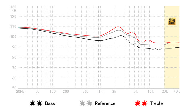 再生周波数帯域は10Hz〜40kHz、インピーダンスは16Ω、感度は108dB±3dB@1kHz。