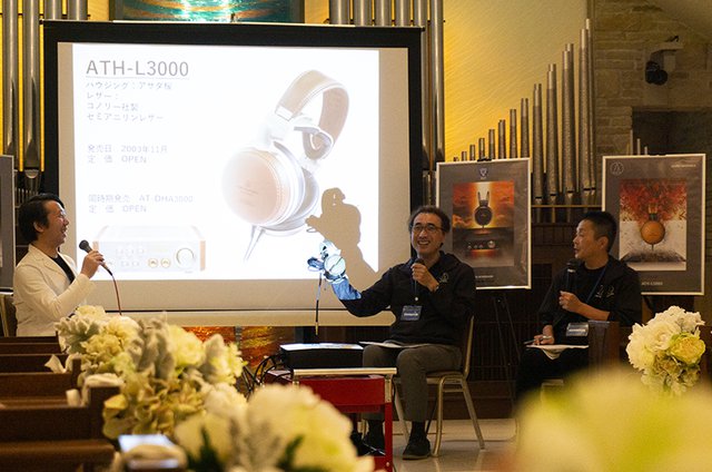 また2日15時からはチャペルにてトークイベントも開催された。評論家の岩井 喬氏を聞き手に迎え、開発を担当した小澤氏と営業を担当した平田氏が、同社の"木のヘッドホン”歴代モデルのエピソードを披露した。