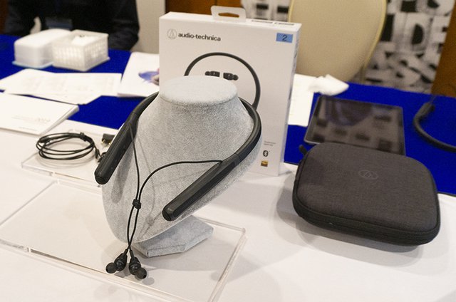 11Fには、ダイナミックドライバー/BAドライバー/パッシブラジエーターによる世界初のハイブリッド構成を採用したイヤホン「ATH-IEX1」や、完全ワイヤレスイヤホンの入門機「ATH-CK3TW」、有線接続でハイレゾも聴けるネックバンド型ノイキャン/BTイヤホン「ATH-ANC400BT」などが取り揃えられていた。