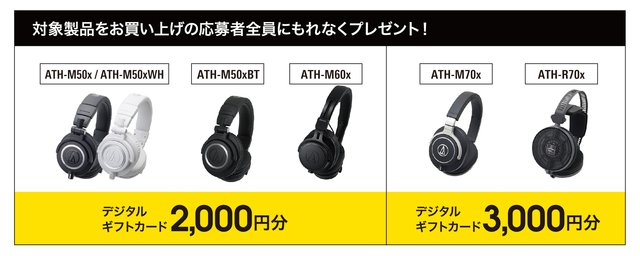 対象製品は、同社ヘッドホン「ATH-R70x」「ATH-M70x」「ATH-M60x」「ATH-M50xBT」「ATH-M50x」「ATH-M50xWH」の6モデル。製品を購入した際のレシート/証明書および外箱のバーコードとシリアルを写した画像を、キャンペーンWEBサイトの応募フォームから必要事項とともに送ることで、製品に応じて3,000円または2,000円のデジタルギフトカードがプレゼントされる。