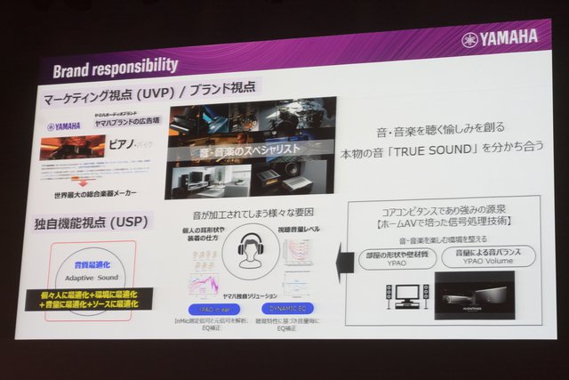 各製品の特徴については、同社AV・流通営業部マーケティング課課長の飯田哲也氏が解説した。飯田氏はヤマハブランドの強みとして「プロからコンシューマー、音の入口から出口までサポートする世界規模の楽器総合メーカーであること」を挙げ、またAVアンプに代表されるホームAV分野では、リアルな音響を再現する独自の信号処理技術を培ってきたと説明。今回の新製品でも、それらの特徴を活かしたと語る。