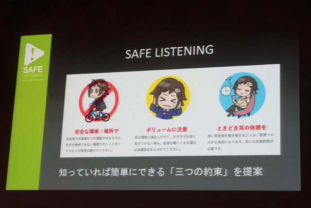 リスニングケアについては、(株)須山歯研代表 須山慶太氏が、聴覚保護の観点から機能の意義を補強する。耳をいたわりつつ音楽を楽しむ「セーフリスニング」を推進している須山氏は、ポータブルオーディオが音楽を手軽に楽しめる反面、「再生音量が大きすぎる」「周囲への注意が散漫になる」等のリスクに気づきにくい事を指摘。