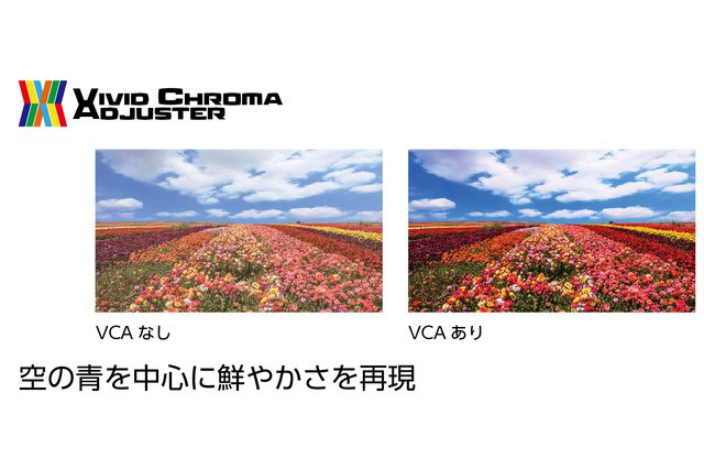 映像エンジンには「4K 美・彩・細エンジン」を新しく搭載する。HDRでない映像であってもリアルタイムに分析しコントラストを改善する「コントラストリマスター」、色相レベルの12軸補正と3D-LUTを組み合わせることで、空の青は鮮やかに、肌色をより自然な色といった表現ができる「ビビットクロマアジャスター」にも対応する。
