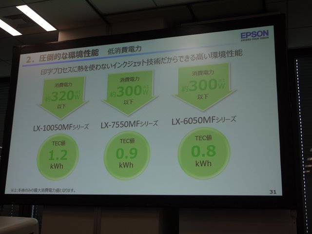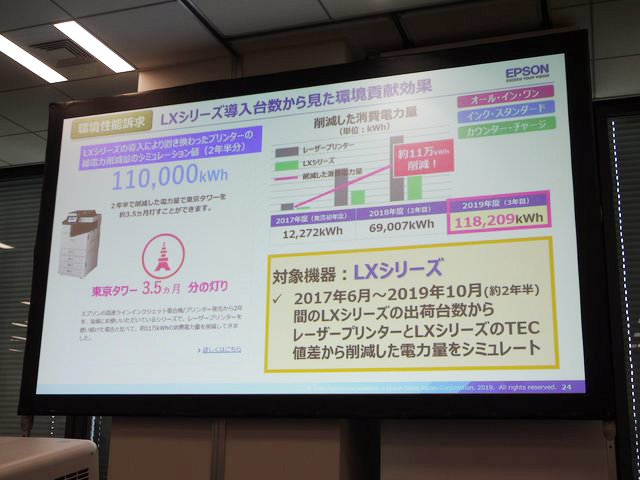 また同社が展開するLXシリーズの2年半の出荷台数から換算し、削減されたと想定される電力は11万キロワットアワーにのぼるといい、これは「3.5ヶ月分東京タワーを灯すことができるもの」と同等だと説明された。エプソンではこうした取り組みによってさらなる環境貢献を進めていくとし、「賛同くださる皆様とともに、ビル全体、街全体に広げたい」との意気込みを示した。