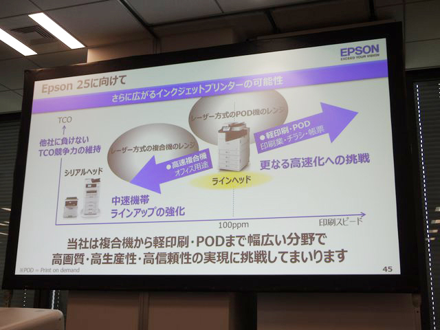 久保田氏は、「エプソンでは、プリンターをレーザーからインクジェットに替えていくという目標をもつ。新商品のフルラインナップであらゆるお客様のニーズに応える」と意気込みを高める。またさらなる高速化への挑戦とともに、コストダウンを実現させボリュームゾーンである中速機帯の商品ラインナップを拡充するなど、今後もインクジェットプリンターの可能性を広げていくとし、「オフィスプリントの変革は始まったばかり、将来に向け開発活動を行なっていく」と締め括った。