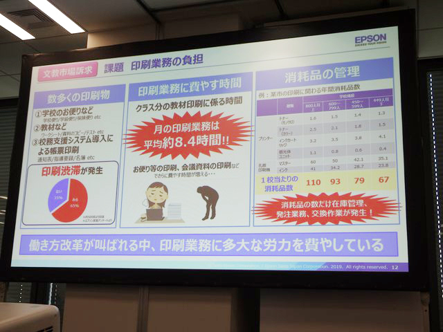 文教向けにプロジェクターなど広く展開するエプソンでは、日頃から学校の現場につぶさに触れ「学校環境では印刷の機会が多いが、そこには課題が多いと認識。LXシリーズでこれを大きく改善することができると確信した」という。