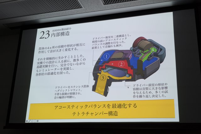 開発されたトゥルーベリリウムドライバーは非常に繊細な面を持ち、ハウジングの内部容積の違いが音質へ敏感に反映されてしまう。そのため、A8000内部は4分割の「テトラチャンバー構造」を採用。各部で何度も試作を繰り返し、内部容積を極めて高精度に最適化したという。