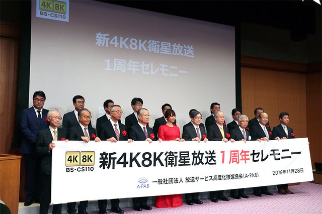 セレモニーにはまず、A-PABの福田俊男理事長が登壇。「新4K8K衛星放送は2018年12月1日にスタートし、直後は足踏みの状況であったが、対応機器も揃ってきており、また2020年の東京五輪に向けて需要も伸びている。10月末までの視聴可能台数が200万台をようやく超え、順調に増えてきた」とコメント。機器の充実に加えて、ピュア4K放送も増えてきたとし、今後もさらなる普及に尽力すると語った。