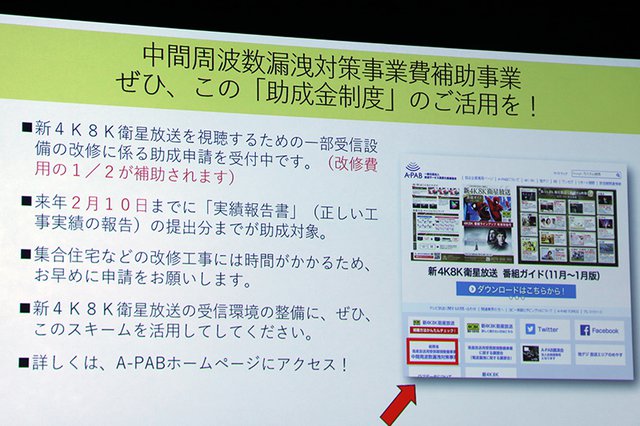現在総務省では、右左旋対応アンテナを設置した際の電波漏洩対策に対する助成金制度を実施している。新4K8K衛星放送受信のためにアンテナに交換・設置した際、左旋の中間周波数電波が漏洩してしまうと、2018年4月の法改正により定められた漏洩基準を満たしていないと判断され違法となる。そのための対策を補助するもので、対象となるには2020年2月10日までに申請が必須。予算はおよそ6億円。まだ申請には余裕があるとのことで、早めの申請が推奨されている。