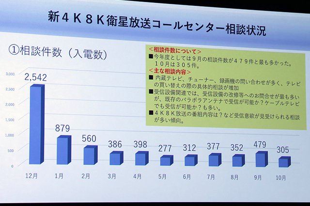 また実際の視聴者状況として、A-PAB 4K8K推進センター長の宇佐美雄司氏からコールセンターの相談状況が報告された。9月時点ではテレビ買い替えに関する相談が増加していたが、10月には305件と減少。今後は冬のボーナス商戦に向けて増加が見込まれるとした。相談者のおよそ8割は男性とのこと、また年齢は60代が最も多く、50代、70代が続くかたちだ。