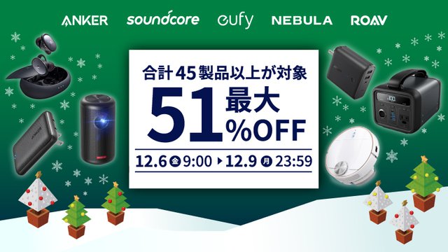 Ankerは、本日12月6日9時からスタートした「Amazonサイバーマンデー」において、グループの全ブランドの50製品以上を最大51パーセントオフで販売する。