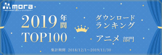 このランキングは、12月5日に発表された「mora 2019年 年間ダウンロードランキングTOP100」を元に、通常音源とハイレゾ音源のダウンロード数を合算したアニソン(アニメソング/声優/ボカロ/ゲームテーマ曲を含む)を2018年12月1日から2019年11月30日までの期間について集計したものとなる。