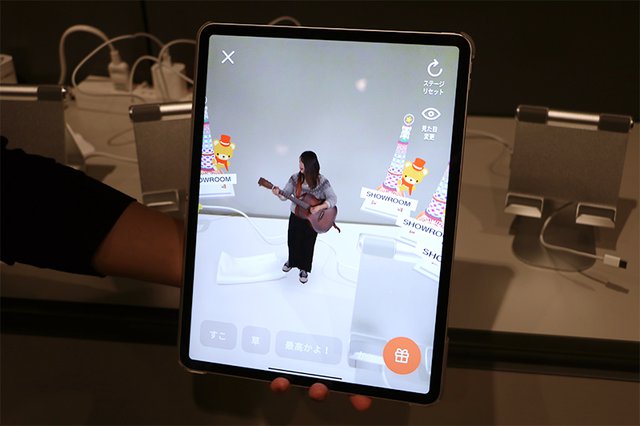 これにより、スマホ上のタッチ操作でステージを360度方向から見ることができ、ピンチイン/アウトの操作で会場の視点も変更可能。会場ではキャラクターによるライブ動画のデモンストレーションが行われたが、映像はライブ配信も可能。さらに実写の映像配信も開発が進んでおり、アーティストが配信することもできるようになるとのこと。こちらはデータ量も多く、5Gサービスがスタートして以降の実装が見込まれる。
