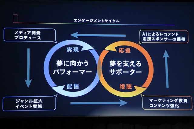 前田氏は、「これら新規事業は全て “舞台(ステージ)” に相当すると考えている。基幹事業であるライブ配信 “SHOWROOM” は、数千人のファンがついたり、一定数の規模拡大は可能だが、テレビや映画などのようなマスメディアの世界に展開するには力不足だと感じていた」と説明。