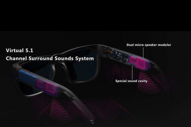 本体内には独自の超小型スピーカーを内蔵しており、オープンイヤーながらも迫力の音声を楽しめるとのこと。5.1chのバーチャルサラウンドシステムにも対応する。