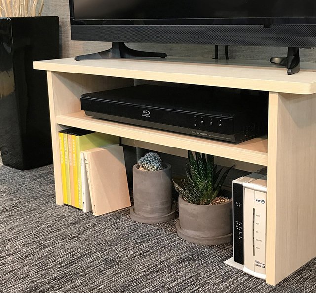 ラック背面にコード専用の配線口を確保することで、ラックを壁面にぴったりと配置できる。天板の前面は角が丸くなっており、安全面にも配慮。棚上にはレコーダーを、棚下にはDVDなどが収納できるスペースを確保している。また、棚下にはストッパーを備えており、DVDなどが奥に行きすぎないように設計されている。