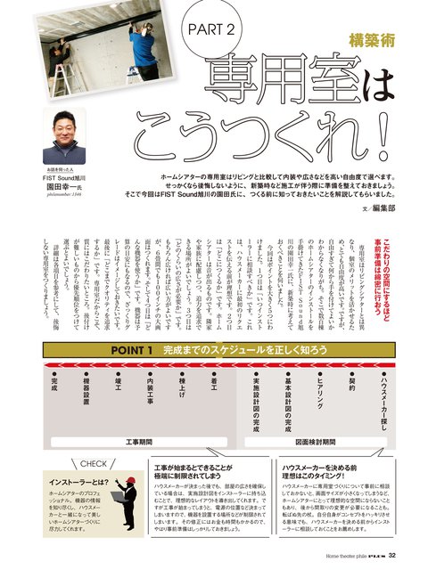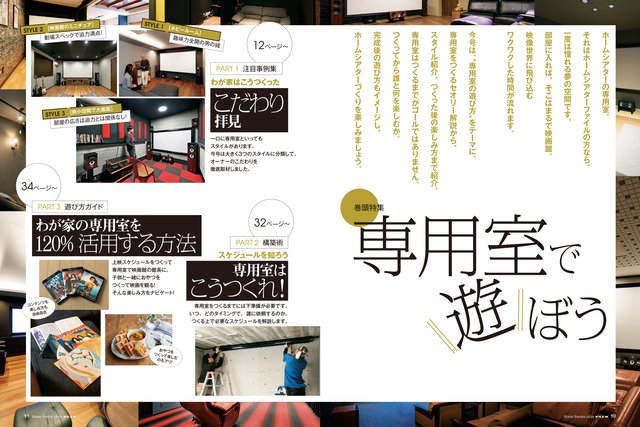 今号の巻頭特集は、専用室で遊ぶことをテーマにし、実際に専用室をつくった先輩達のこだわりを紹介する事例集を掲載している。専用室の姿は多種多様だが、今回は大きく3つに分類して紹介。「画質と音質を追求した映画館のミニチュア」「狭小空間で迫力の大画面」「大人のおもちゃ箱のようなホビールーム」。いずれもオーナーが考え抜いた空間である。
