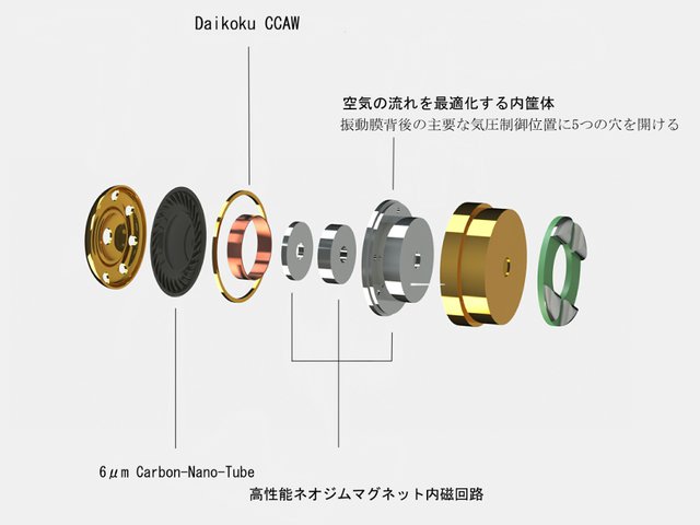 6μmCNT(カーボンナノチューブ)の振動板を採用した10mm径ダイナミックドライバーを搭載。同社独自開発のユニットは、振動膜背後の二つの主要な気圧制御位置から同じチャンバーに背圧を誘導し、一つのフィルターで制御することで、空気の流れのバランスを取り、振動板を効率よく振動させるという。