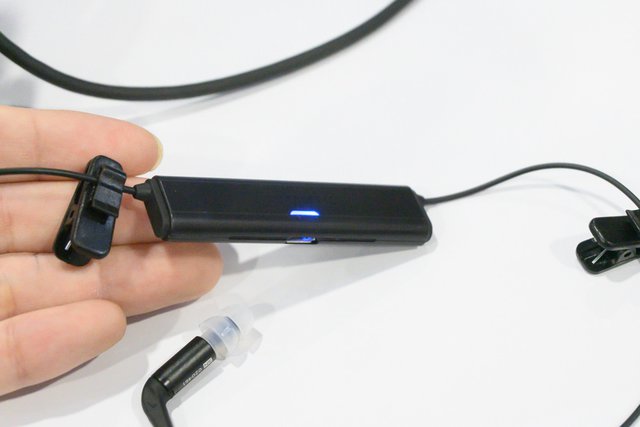イヤホンとの接続コネクターはMMCXのため、他社製のイヤホンでも使用可能。ケーブルには3ボタンのリモコンを搭載、マイクも内蔵しており通話も可能だ。また周囲の音を聞くことができる外音取り込みモードも備える。そのほか、2つのシャツクリップとバッテリーを備えており、充電端子はmicroUSB。8時間以上の連続再生が行える。