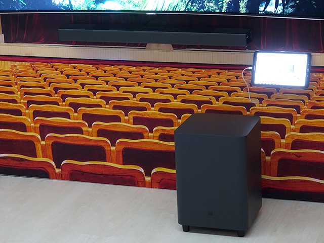 JBLのサウンドバーとして初めてドルビーアトモスに対応。4基の上向きイネーブルドスピーカーを搭載している。サブウーファーのユニットサイズは10インチ。総出力は820W。