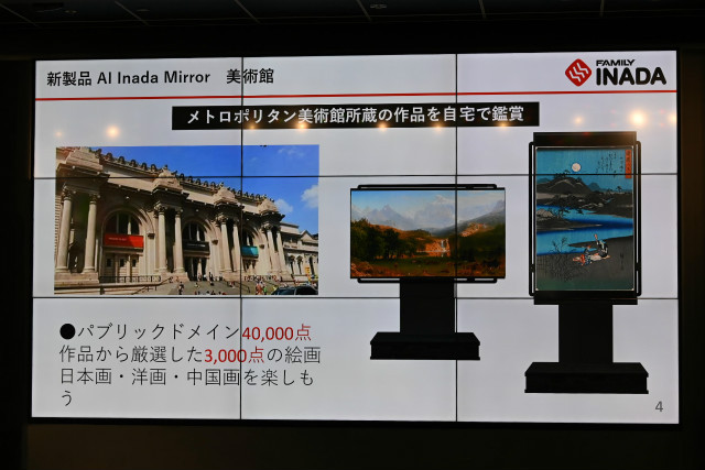 その他、メトロポリタン美術館に収蔵されている絵画を4K解像度で表示する「美術館」、搭載するカメラで自宅を監視し、異常を感知した場合にユーザーのスマホへ通知する「みまもり」、スマホの画面をミラーリングできる「画面共有」といった、間接的にユーザーの生活をサポートするコンテンツも用意されている。また、季節ごとにアップデートを配信し、コンテンツを追加する予定。第1弾としてはメイクとヨガに関するコンテンツを用意しているそうだ。
