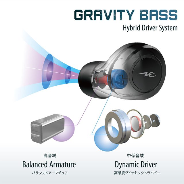 高音域用のバランスド・アーマチュア1基と、重低音を再生する6mm径ダイナミックドライバーを組み合わせた、新開発のハイブリッドドライバーシステムを搭載。バランスド・アーマチュアは、忠実に振動板を駆動し解像度の高い繊細でクリアな伸びのある中高音域を再生。ダイナミックドライバーは、振動板の駆動時に発生する背圧を最適化するよう設計され、迫力のある重低音を実現するとしており、「GRAVITY BASS」と称して重低音をアピールする。